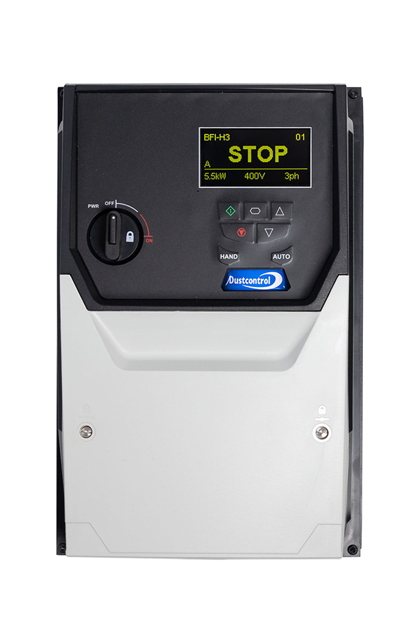 Smart Panel will always be used in combination with an externally mounted frequency converter for starting and controlling the motor. With Smart Panel, Dustcontrol is taking a step forward and leaving behind the older types of starting devices. A frequency converter offers more possibilities in terms of system control and is a more energy-efficient solution. For the customer, this will place less demand on the fuse and require smaller cable dimensions for installation. This means that cables previously located in the controlbox are now moved outside closer to the system.