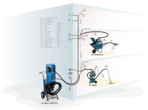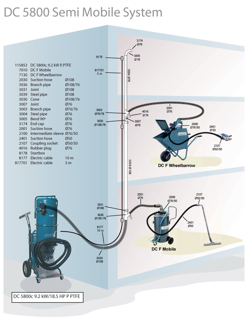 The DC 5900/5800c can be docked to a temporary or permanent tubing system installed in the work area. With a branch pipe package like below (item 3353), a temporary pipeline can be built in a stairwell or in a shakt. Several branch pipe packages can be connected in series or in branches.