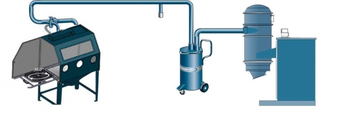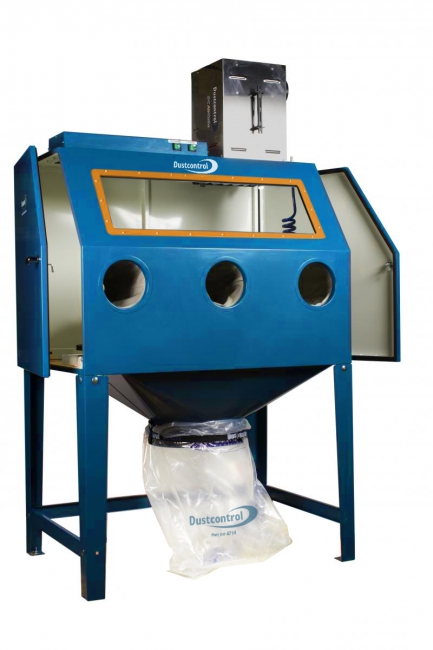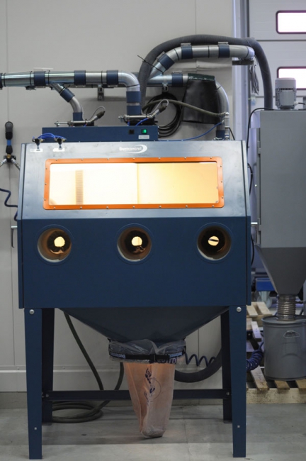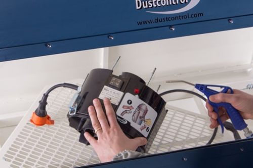 The DC Box is designed like a fume-cupboard with a door on each side to pull the equipment in and out. It is equipped with a ø 76-connection to source extraction and a connection to our DC AirCube 500*, along with lighting and compressed air. A disposal sack for heavy dust and used filters is attached to the bottom of the DC Box.
