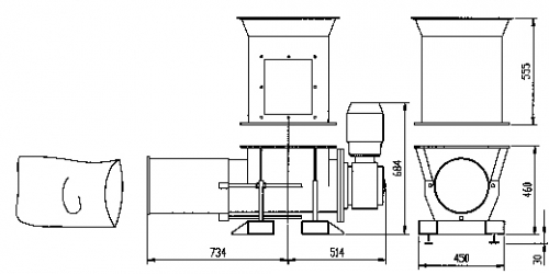 This arrangement is used for material that can be compacted, e.g. paper dust and strips. Collected material is compacted and discharged into a plastic collection sack. The drive motor control should be configured to reverse for several seconds to clear occasional clogs.